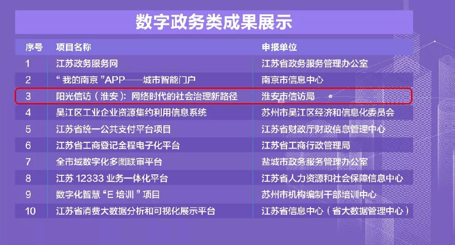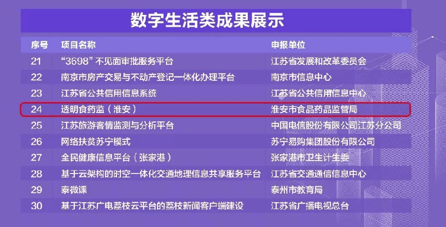 9月26日,2018(第六届)江苏互联网大会开幕式上传来喜讯:由 我公司联合市食药监局打造的淮安“透明食药监”和我公司联合市信访局打造的淮安“阳光信访”两个项目获评“数字江苏”优秀实践成果。据悉,“数字江苏”优秀实践成果评选活动由江苏省委网信办、省发展改革委、省经济和信息化委共同举办,旨在回顾总结近年来江苏信息化建设的成功经验,宣传推广数字江苏实践成果。活动自8月份启动以来,经过基层单位申报、业务部门推荐和多轮专家评选,从208个数字江苏实践案例中,遴选出共30个优秀实践成果;其中淮安3个项目入选,我公司占其中两大项目。