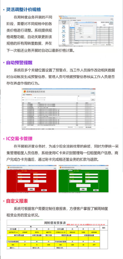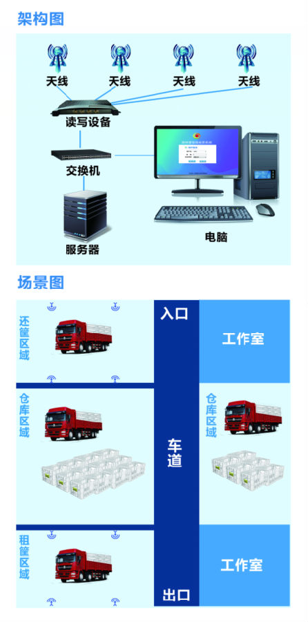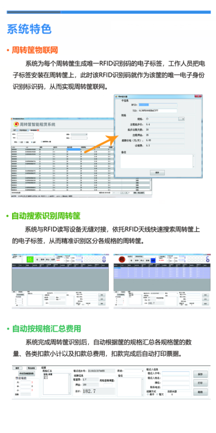周转筐智能租赁系统是依托RFID无线射频技术,为每个周转筐分配唯一RFID识别码,利用RFID天线精准搜索与管理每个周转筐,实现对周转筐的自动识别、汇总、盘点等功能,自动采集每次租、还筐业务数据等功能,减少大量人工工作量。系统还可以为不规格的周转筐设置不同的押金、租赁费、还筐费、超时费,损坏罚款等收款款项,并在租还业务时自动计算汇总各个款项,实现对周转筐租赁的精细化管理。